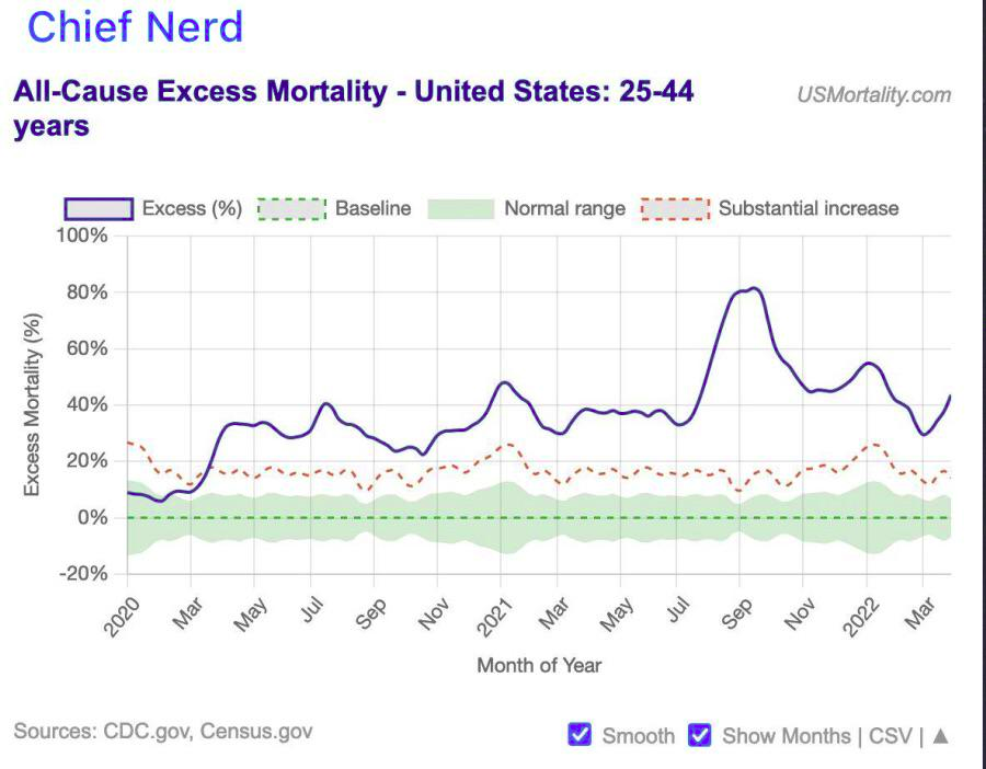 8. It's Happening - The Carnage caused by mRNA Vaccines The following graphs provide some indication of the carnage being wrought by these vaccines. The first graph relates to the increase in deaths amongst atheletes from sudden cardiac incidents: the only logical cause for this being thaty sport authorities stupidly mandated that all athletes had to submit to Anti-COVID Injections even though this group was one of the lest likely to be endangered by the COVID-19. |