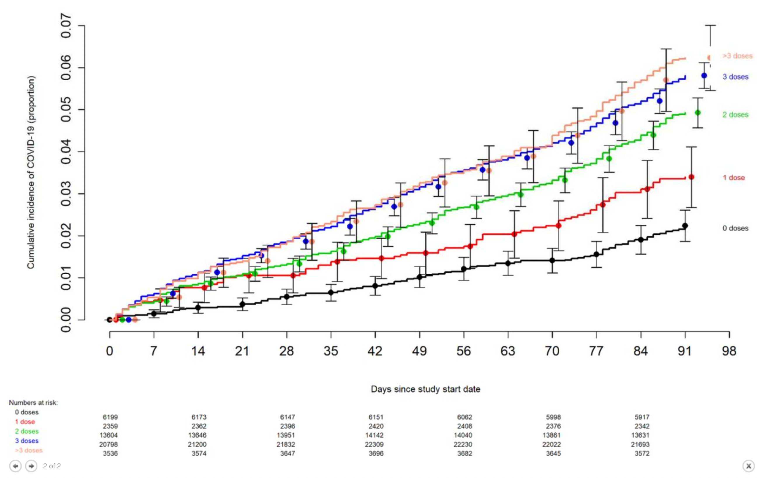 6. COVID-19 Vaccines do not stop infection and do not stop infected vaccinated persons infecting others Cleveland Ohio Medical Clinic - Trial results The Cleveland Ohio Medical Clinic gathered data on over 50,000 patients, relating their susceptibility to COVID and the number of COVID-19 mRNA injections they had received. In this there was a clear relationship. The more injections, the greater the risk of infection, hospitalisation and death. |