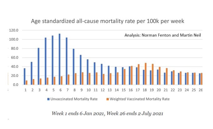 This third graph shows the increase in all-cause mortality rates since vaccination began. Not shown here is the difference between vaccinated and non-vaccinated persons. It is reported that insurance companies are reporting an increase in deaths above the average by 40%. See this video to gain a full picture as to the nature of these excess deaths. |