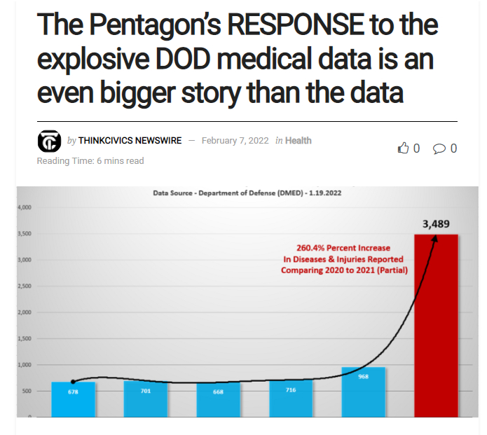 This second graph shows the sudden uptick of deaths and injuries occurring in the US Military as reported by the Dept of Defence Medical Database. This database has been subsequently shut down with the DoD claiming there is a fault in the system such that the figures are exaggerated. |