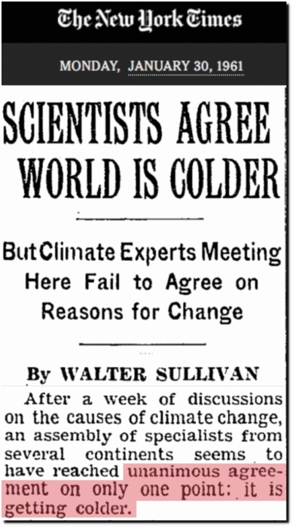 In 1961, there was unanimous consensus for global cooling. Somehow between then and now, the temperature data for over 100 years has been revised such that the past was made cooler and the present was made warmer. Below are displayed graphs of raw data recorded from temperature monitoring networks around the world. They all show the same cooling trend. For all of these networks, operated over very long periods of time by persons who did not collaborate, nor even communicate with each other, to be erroneous is just not plausible. The raw data, before it has been adjusted by those who are selling the narrative the earth's atmosphere is warming and that this warming is the result of increasing concentrations of CO2, shows a distinct cooling trend, in fits and starts, over the last 100 years. In recent times, the hottest period seems to be around the 1930s.