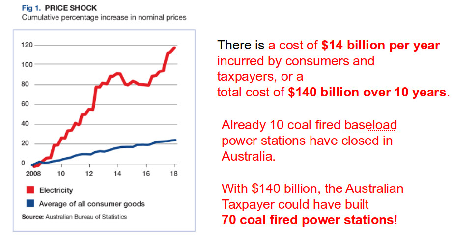 As shown in Figure 1 opposite, since the introduction of renewables into Australian electricity systems, despite frequent assurances from advocates of renewable energy that the cost of energy would actually become less, the cost of electricity has risen almost 6 times the Consumer Price Index. This is because injecting intermittent power into an electricity grid drives baseload generators into diseconomy. Added to that, consumers and taxpayers are subsidising the introduction of the equipment associated with renewables; namely, solar cells, windfarms and modifications to the electrical reticulation network in order to accommodate their vagaries. These changes and the presence of renewables are causing the electricity generation to be inefficient. Worse still, a significant portion of the money being expended is going to the Chinese Communist Party, the main supplier of renewables hardware.