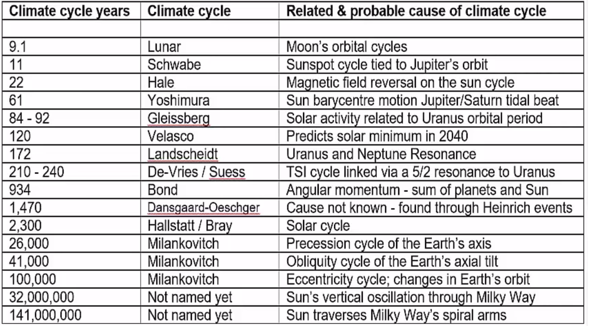Shown here is a table, courtesty of Dr Robert Holmes, listing 16 celestial cycles that are known to affect the earth's climate.