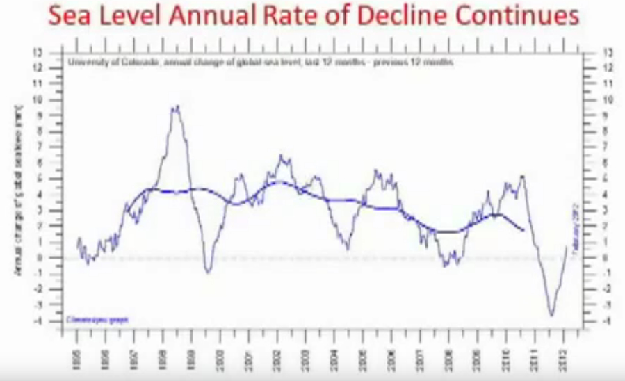 Included here is a graph from a presentation by John L Casey, based on data from the University of Colorado, showing sea levels dropping.
