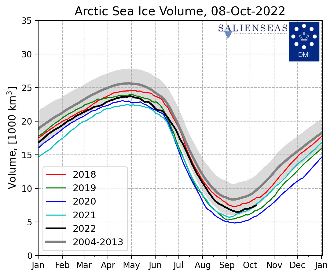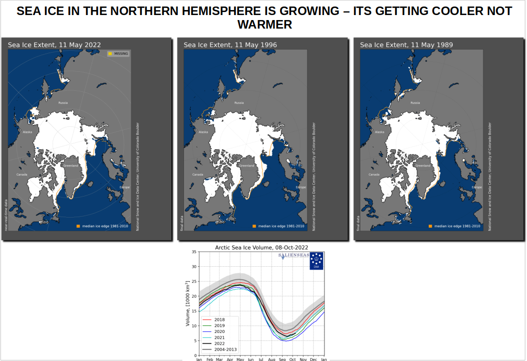 If you look at the two maps of the Northern Ice Extent opposite you can see that it is gradually growing. If you click on the graph of the Ice Extent as at September 2022, you will see that this year it has been significantly greater than recent years. The ice extent is growing and is expected, sporadically, to grow until at least 2035 when the earth will be deep into a Grand Solar Minimum. You will learn about this later in this webpage.