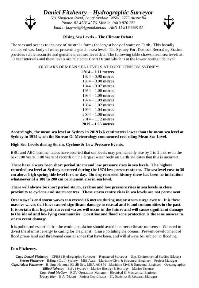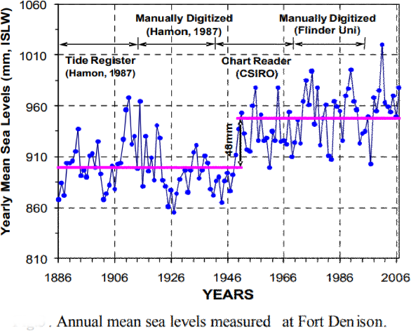 Shown, above, is a report regarding the sea levels recorded at Fort Denison in Sydney Harbour produced by Daniel Fitzhenry - Hydrographic Surveyor. This fits well with the official record, shown to the right of Fitzhenry's report. Note in the official record that the sea level is shown as having risen by 48mm around 1952. This occurred as a result of choosing a different system of measurement, using a different data point 48 mm lower than the previous one. The general trend shown in the official record is either stagnant or downwards.