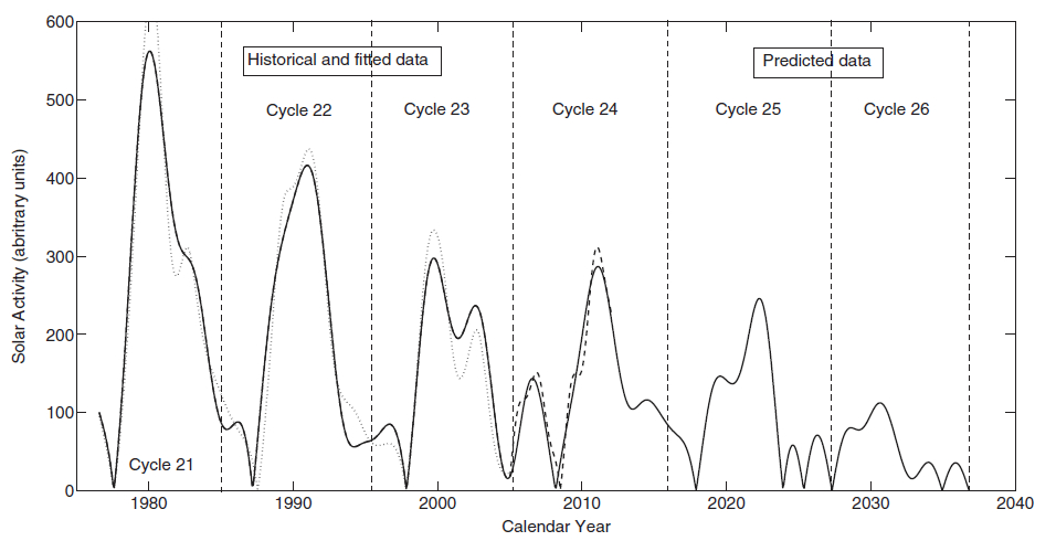 A phenomenon called "The Grand Solar Minimum" has begun. The sun operates in cycles of around 11 years. As can be seen from the illustration, the strength of these cycles is decreasing. Added to that, there exists within the sun magnetic disturbances that cause sunspots. These disturbances affect the level of output of solar radiation by the sun. Professor of Mathematics at Northumbria University, UK, Dr Valentina Zharkova's research team have now successfully modelled the behaviour of the magnetic disturbances of the sun.