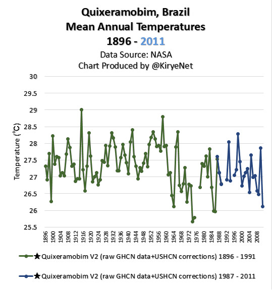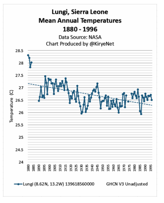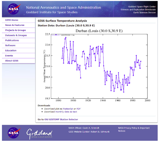 The data presented in the US and Australian temperature graphs, up until fairly recent times where there is a much higher level of global communications connectivity, is the result of two groups, comprised of thousands of public servants, making tens of thousands of temperature measurements over a period longer than 100 years without any opportunity for those two groups to collude. The data they recorded, one group in the Northern Hemisphere and one in the Southern Hemisphere, almost perfectly on the other side of the planet to each other, records the same downward trend. The same comment applies to the other plots from other parts of the world. The temperatures are falling and have been doing so in fits and starts for over the last 100+ years. The chance of these independently operating groups getting the data wrong is infinitesimally small.