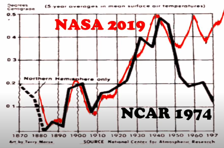 Opposite is a graph that was published by the National Center for Atmospheric Research around 1974. This correlates closely to a graph which will be shown later, derived from raw historical data captured by the US Climatology Network. By 2019, personalities at NASA, most likely Mr James Hansen and Mr Michael Mann, had gradually altered this data as depicted by the read line so that there has been a cooling of the past and a warming of the present.