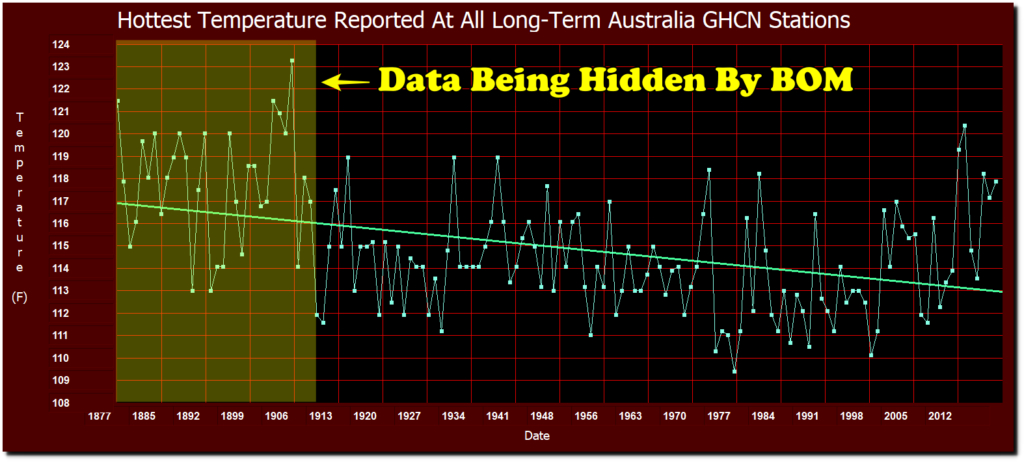 All of these temperature plots have one common thread. The trend is downwards. However, you will note that the Australian trend starts to diverge from the US downwards trend in the last 15 or so years since the management of the Australian Bureau of Meteorology started to fiddle with the raw data, and the methods/equipment used to collect the raw data, to fit the global warming narrative espoused by Jim Hansen to a US Congressional hearing in 1988.