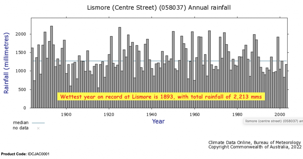Fig 3. Lismore Annual Rain 1880-2022 — Click on Picture to Enlarge.
