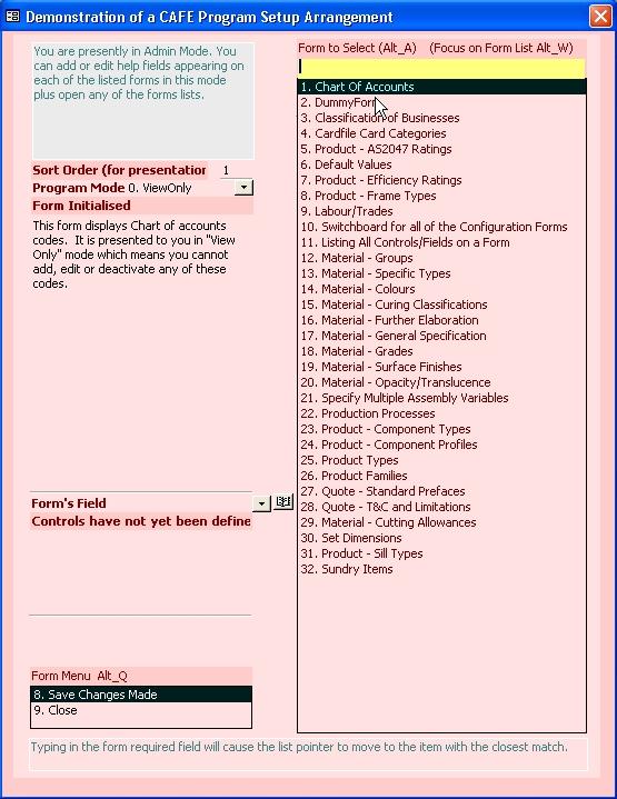 When used in the context of sub-para a. above, CAFÉ's aim is not only to to provide a standard, useful to programmers for the production of easy-to-use, efficient forms, but also to couple these forms to a standard Open Source database engine such as FirebirdSQL or PostgreSQL. It should be noted that although the front-end of the CAFÉ demonstration application, at the time of writing, uses Microsoft Access and Microsoft's Visual Basic for Applications, the principles are transportable into any other mainstream programming language, for example, C, Python, Java and Delphi (Pascal). Used in the context of b. above, CAFÉ is a form standard, to be followed by all applications developers producing applications for any company, and provides a guide as to how software should be written such that the code is unambiguous and easy to maintain by successive contractors.