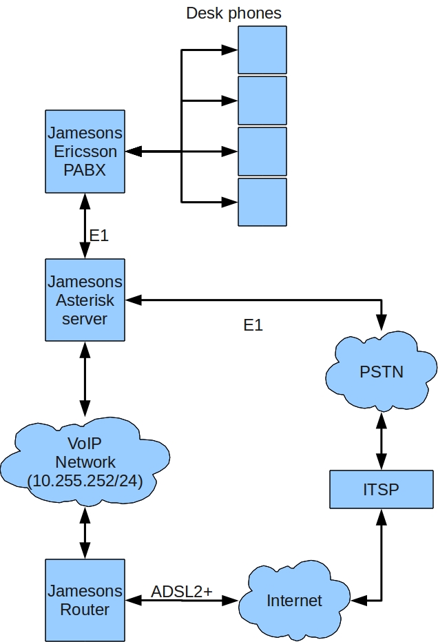 General. All Strata Management agencies have a heavy use of phones. George has an Ericssons PABX installed with a Telstra On-Ramp digital telephone line coming into this establishment. By interposing the Asterisk PABX between the Telstra line and the Ericsson, it was possible to allow all calls to come in through the Telstra lines and for all out-going calls to use a number of companies providing Internet Telephony services at very much reduced rates. It was also possible to provide a number of other superior features through the use of the Asterisk PABX that were not available from the Ericsson. As a consequence of this arrangement, Jamesons now save around $800.00 per month on telephone calls.