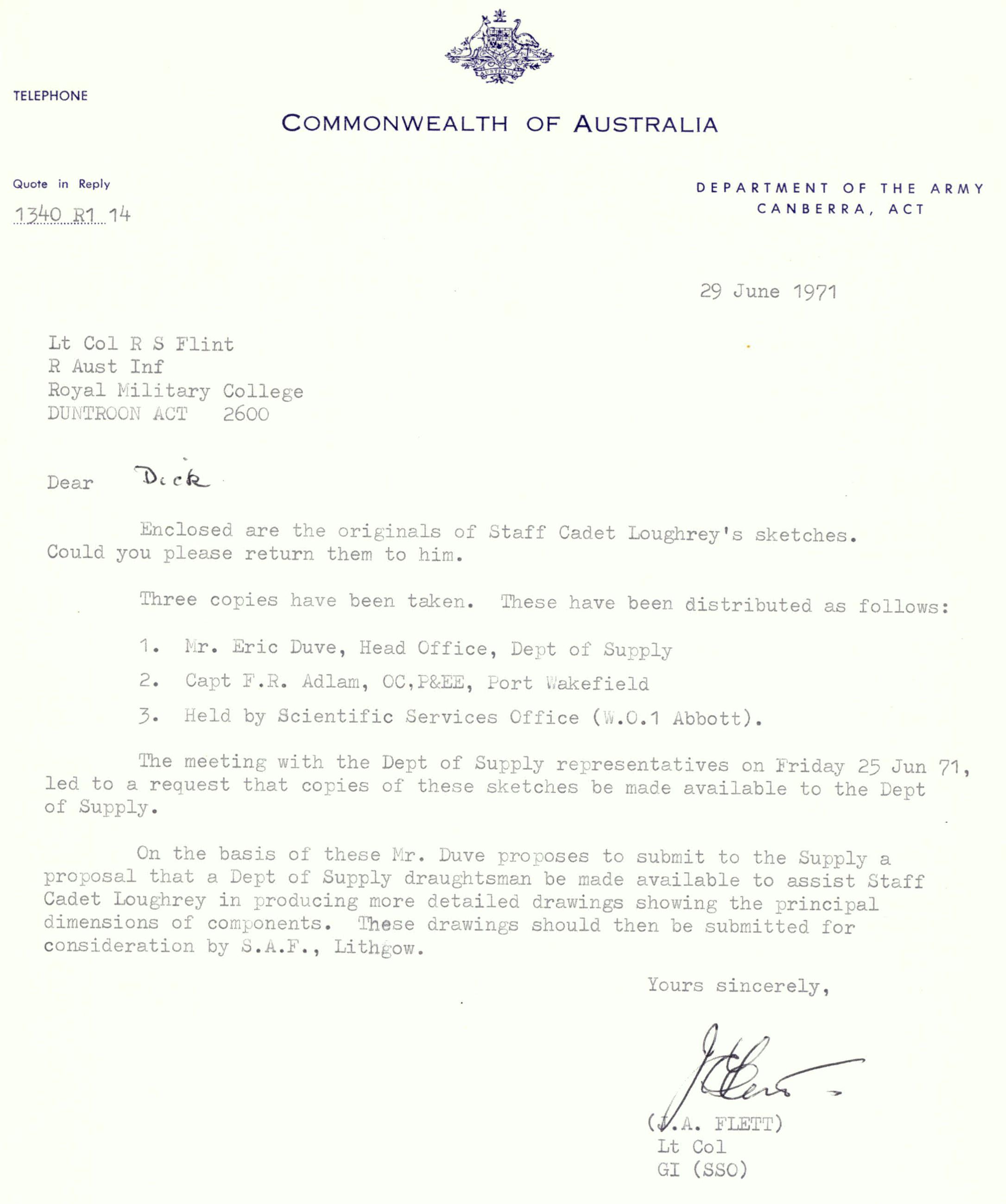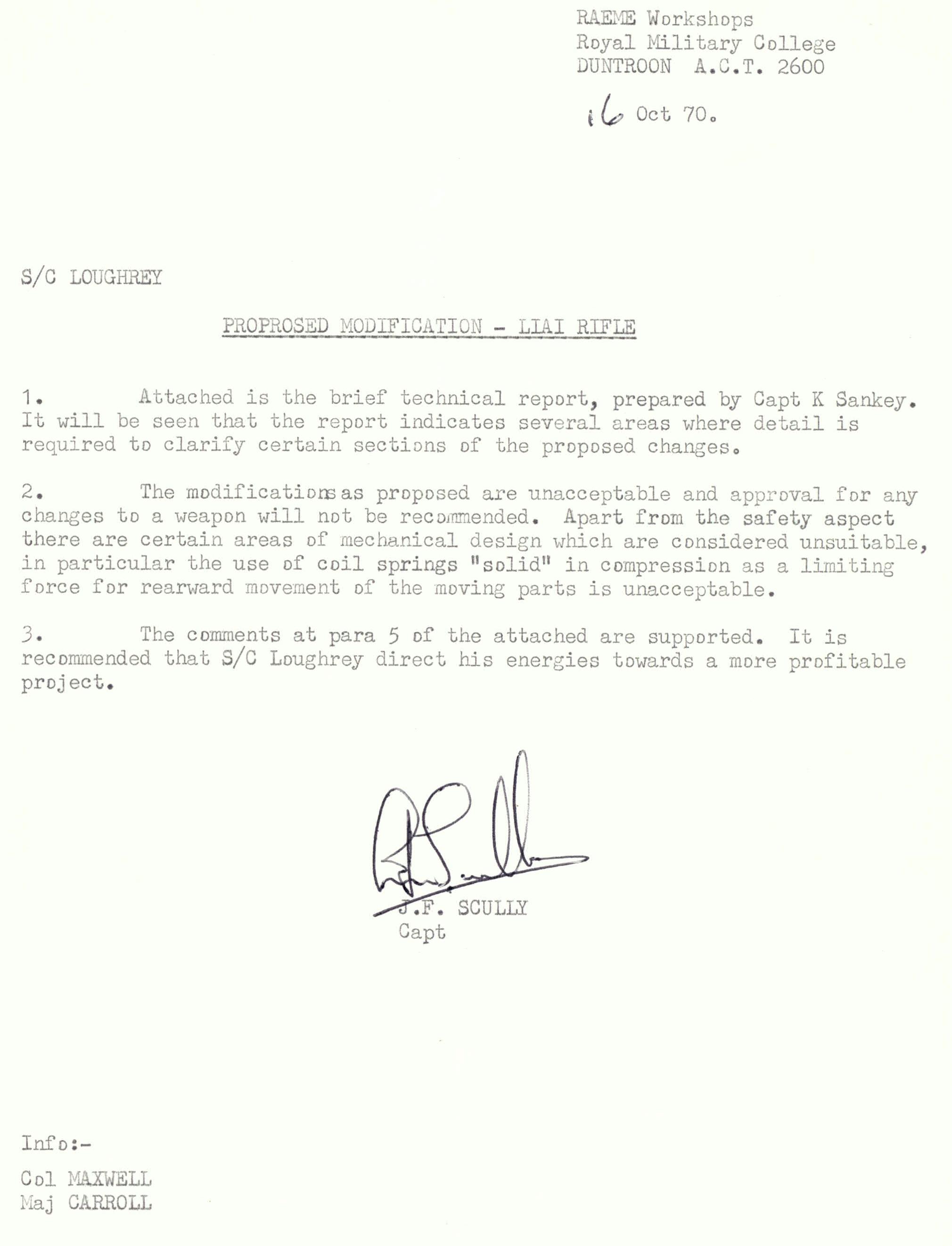 After exercises were finished I drew up plans and tried to interest the Engineering staff at the University laboratories in my ideas. In June of 1970, I finally wrote a very untidy and poorly worded minute to my Commanding Officer, LtCol Stewart asking that I be allowed to take L1A1 rifle parts and construct a working model of the rifle. To my amazement, my Company Commander was directed to pass me to Captain John Scully, the OC of the workshops at Duntroon. John Scully passed my plans to a Citizen Military Forces(CMF) Officer, Capt John Sankey. His opinion was aimed at discouraging me from further attempts to proceed with this idea and so his